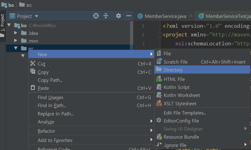 - 프로젝트 하위 test 폴더가 없는 경우 test Directory 생성