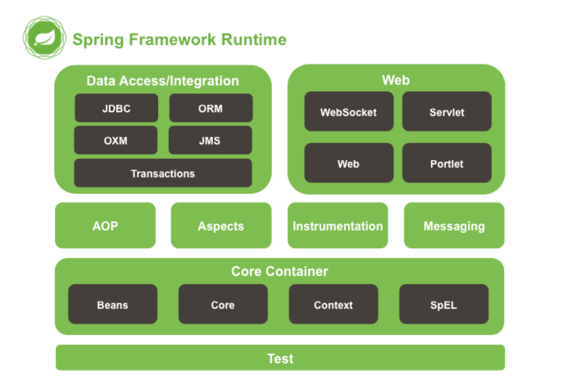 스프링은 위와 같은 구조를 가지고 있으며, Python을 이용한 Django, Ruby를 이용한 Ruby on Rails, Javascript를 이용한 Node.js 기반의 웹 서버 개발과 같이 Java 개발자들은 Spring을 사용하여 웹 서비스를 만들 수 있다.